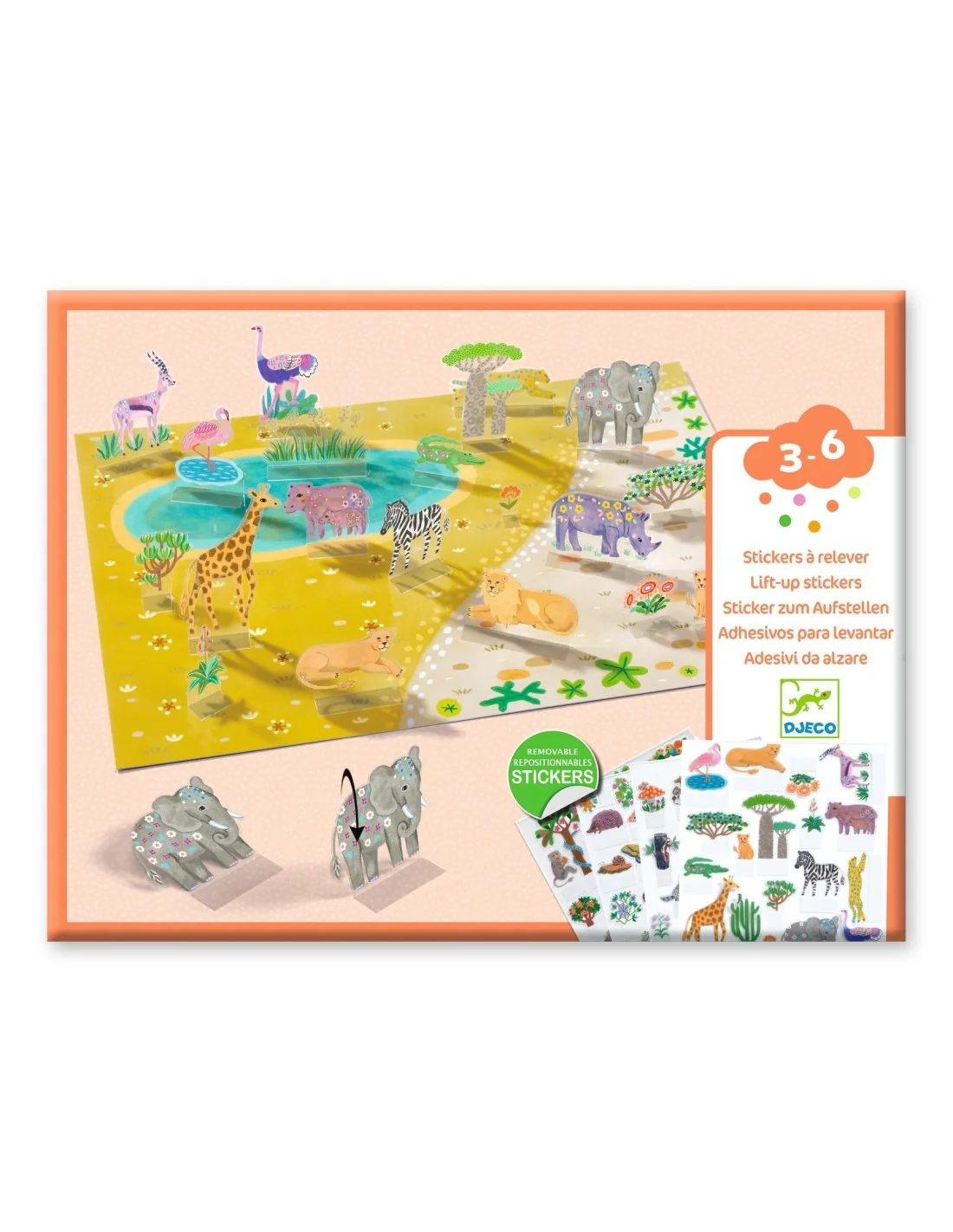 Het kind plakt de verplaatsbare stickers op de grote afbeeldingen en zet ze dan één voor één rechtop... om scènes in 3D te maken en eindeloze verhalen te verzinnen!Verschillende afbeeldingen beschikbaar.