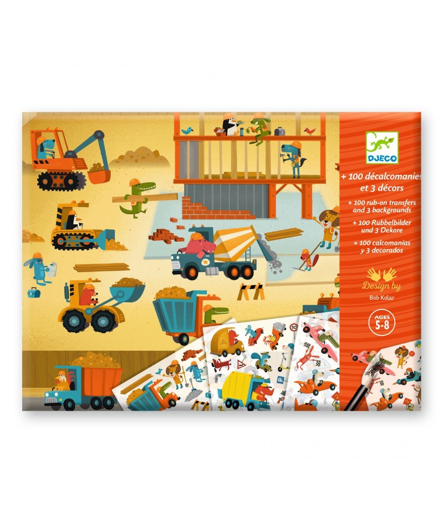 Een groot mapje met een heleboel transferstickers en 3 grote geïllustreerde platen: de kinderen kiezen een decor en leggen er de transferstickers op. Met een potlood wrijven ze de afbeeldingen op de gekozen plaats. Een gemakkelijke en leuke activiteit om in alle vrijheid verhalen te verzinnen en je eigen schilderijen te maken.