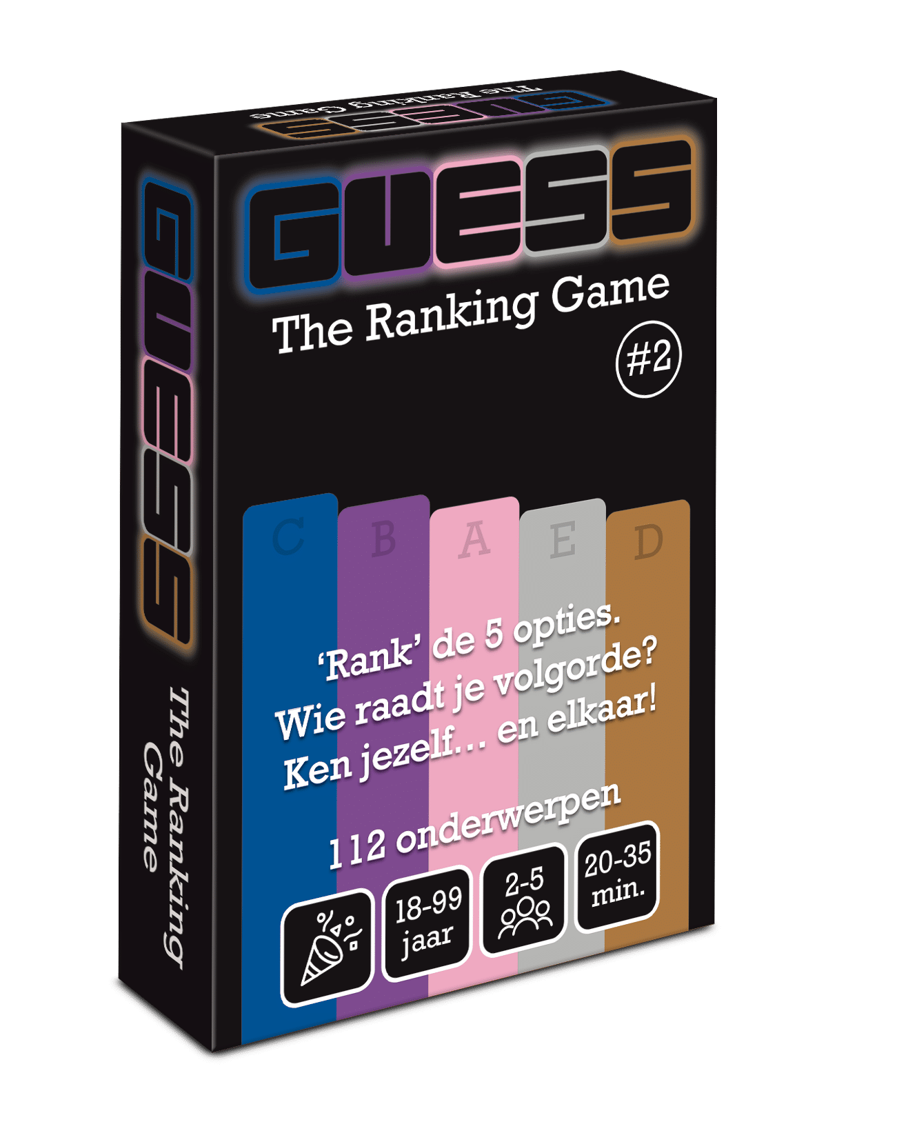 GUESS The Ranking Game – Editie #1 of 2 – Kaartspel is een pocketformaat partyspel / communicatiespel is een pocketformaat waarmee je uitvindt hoe goed jullie elkaar kennen en je elkaar en jezelf beter leert kennen . 1 speler legt de 5 opties van een