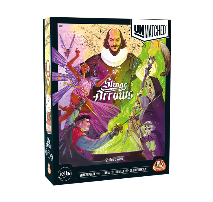 Unmatched: Slings & Arrows is de nieuwste editie van Unmatched, een asymmetrisch miniatuur gevechtsspel die een unieke spelervaring biedt voor twee of vier spelers. In deze variant verandert Shakespeare’s wereldberoemde Globe Theater in een strijdtoernooi voor gevechten waaraan William Shakespeare zelf deelneemt. Hij neemt het op tegen een aantal van zijn wonderbaarlijke personages: De Drie Heksen, Hamlet en Titania.